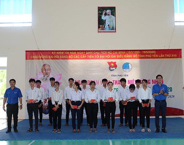 Phó Bí thư Tỉnh Đoàn, Chủ tịch Hội LHTN Việt Nam tỉnh Lương Minh Tùng trao huy hiệu Đoàn và thẻ Đoàn cho đoàn viên mới kết nạp. |