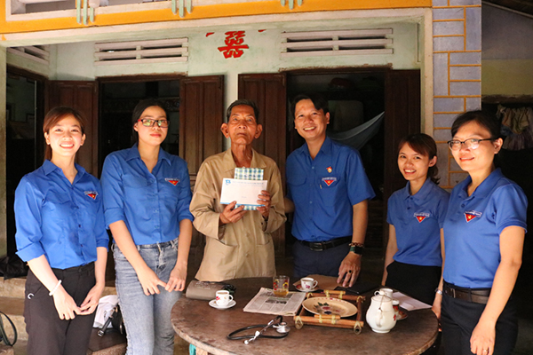 Phó Bí thư Tỉnh Đoàn, Chủ tịch Hội LHTN Việt Nam tỉnh Lương Minh Tùng và đội ngũ y, bác sỹ trẻ khám và tặng quà cho hộ gia đình chính sách tại xã Xuân Lâm. |