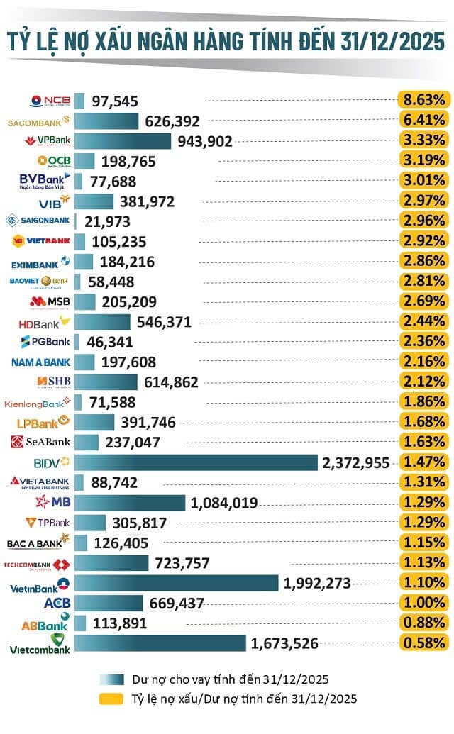 Theo số liệu chính thức, tỷ lệ nợ xấu nội bảng của hệ thống ngân hàng Việt Nam có xu hướng tăng nhanh từ năm 2022-2023 rồi dần ổn định trở lại vào cuối 2024 – 2025 nhưng đang duy trì ở mức cao. Cụ thể, tỷ lệ nợ xấu nội bảng được Ngân hàng Nhà nước (NHNN) công bố cuối năm 2021 là 1,9% (so với 1,69% cuối 2020). Theo báo cáo của IMF trích dẫn số liệu NHNN, tỷ lệ này lên khoảng 2,3% vào năm 2022 và đạt đỉnh 5,9% vào tháng 9/2023 trước khi giảm nhẹ còn 5,3% vào tháng 3/2025.