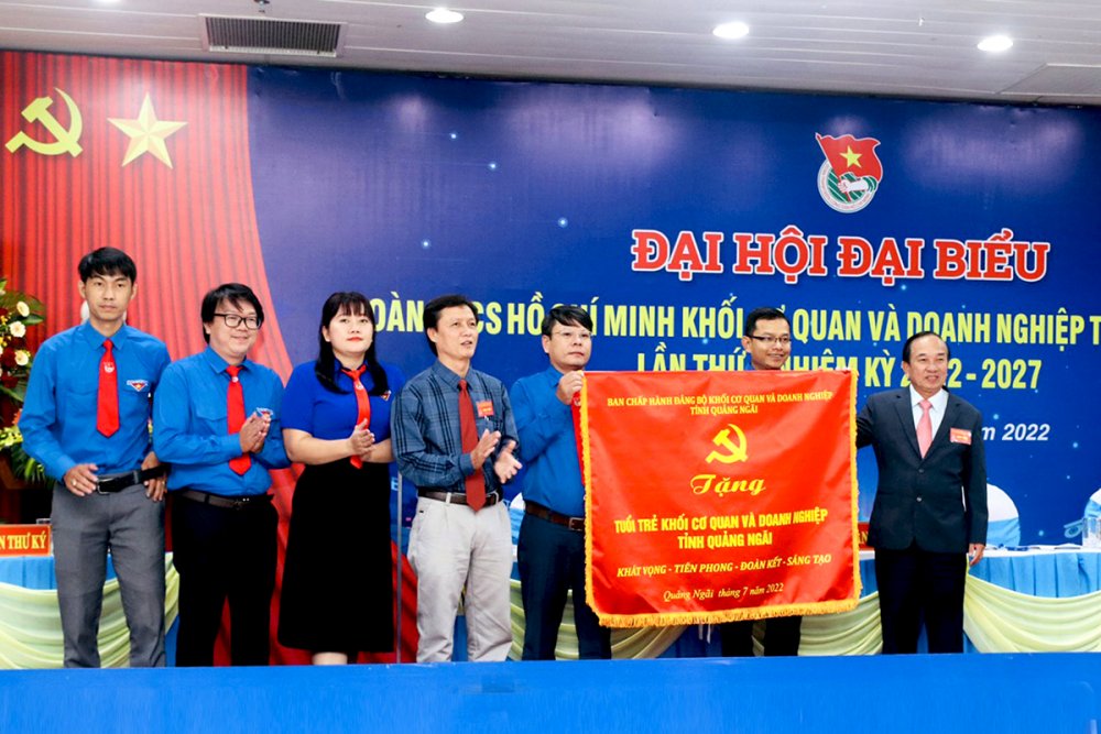 Đảng ủy Khối CQ&DN tỉnh Quảng Ngãi trao tặng bức trướng mang dòng chữ “Khát vọng - Tiên phong - Đoàn kết - Sáng tạo” cho tuổi trẻ Khối CQ&DN tỉnh.