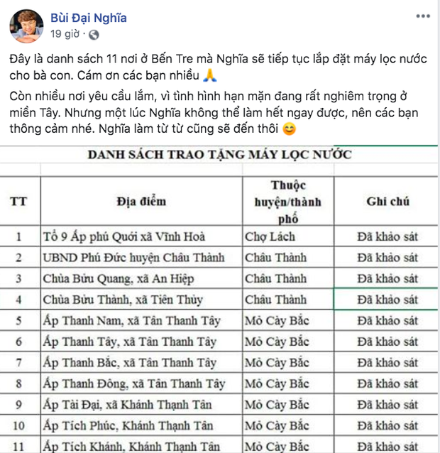 Anh đã chia sẻ 14 nơi mà mình đã lắp đặt và 11 nơi anh sẽ đến trong thời gian tới: "Nghĩa sẽ tiếp tục lắp đặt máy lọc nước cho bà con. Cám ơn các bạn nhiều. Còn nhiều nơi yêu cầu lắm, vì tình hình hạn mặn đang rất nghiêm trọng ở miền Tây. Nhưng một lúc Nghĩa không thể làm hết ngay được, nên các bạn thông cảm nhé. Nghĩa làm từ từ cũng sẽ đến thôi."