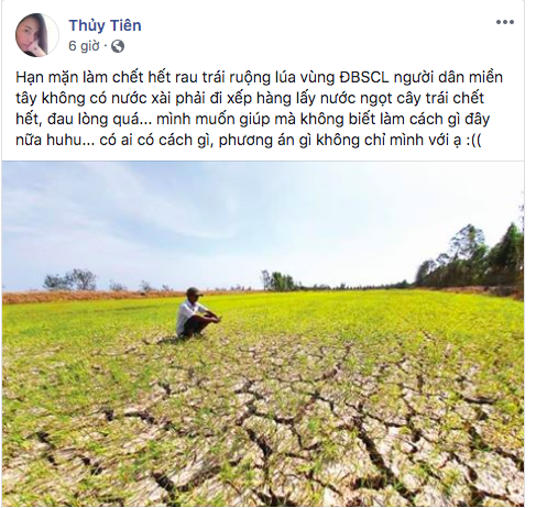 "Hạn mặn làm chết hết rau trái ruộng lúa vùng ĐBSCL người dân miền Tây không có nước xài phải đi xếp hàng lấy nước ngọt cây trái chết hết, đau lòng quá, mình muốn giúp mà không biết làm cách gì đây nữa, có ai có cách gì, phương án gì không chỉ mình với ạ".