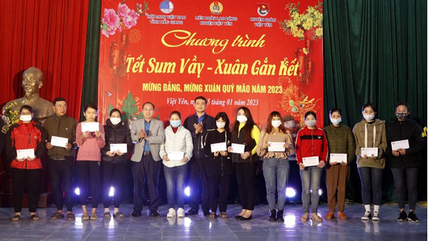 (CTG) Ngày 15/01/2023, tại huyện Việt Yên, Hội LHTN Việt Nam tỉnh Bắc Giang phối hợp với Huyện đoàn, Liên đoàn Lao động huyện Việt Yên tổ chức Chương trình “Tết sum vầy – Xuân gắn kết” vui cùng thanh niên công nhân các câu lạc bộ nhà trọ năm 2023.