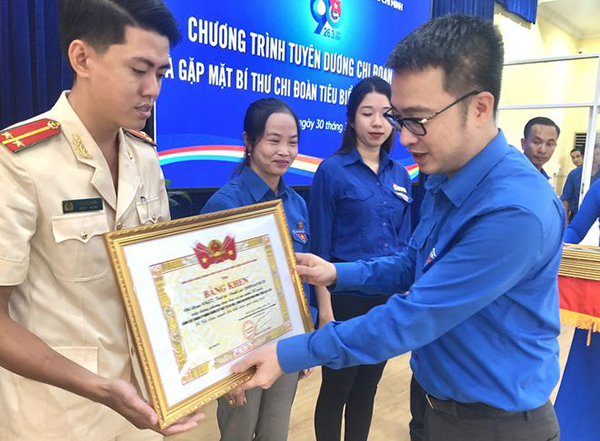 Anh Nguyễn Tường Lâm, Bí thư Trung ương Đoàn, Phó Chủ tịch Thường trực Trung ương Hội LHTN Việt Nam trao bằng khen của Ban Bí thư T.Ư Đoàn cho các Chi đoàn mạnh tiêu biểu toàn quốc. TRẦN NGỌC |