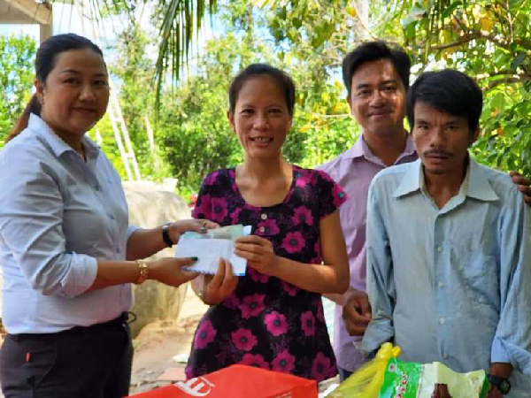 Chị Phương Thảo trao số tiền vận động được cho gia đình. |