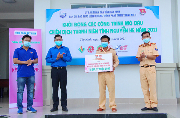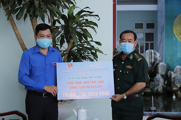 Bên cạnh đó, Tỉnh Đoàn đã tổ chức trao biểu trưng 10km thắp sáng đường tuần tra biên giới đến Bộ Chỉ huy Bộ đội Biên phòng tỉnh Tây Ninh trị giá 230 triệu đồng do công ty xi măng Fico tài trợ 200 triệu đồng và 100 bao xi măng cùng Viettel Tây Ninh tài trợ 20 triệu đồng, hỗ trợ công tác phòng, chống dịch Covid – 19 và góp phần giữ vững an ninh trên tuyên biên giới Việt Nam – Campuchia.