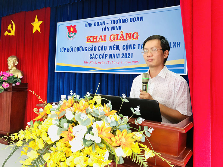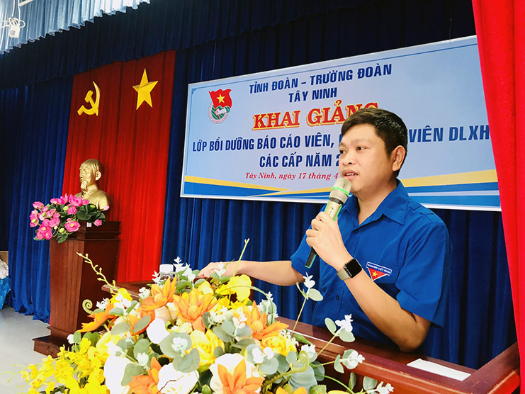 Anh Nguyễn Tiến Tân, Phó bí thư Tỉnh đoàn phát biểu tại lễ khai giảng lớp bồi dưỡng
