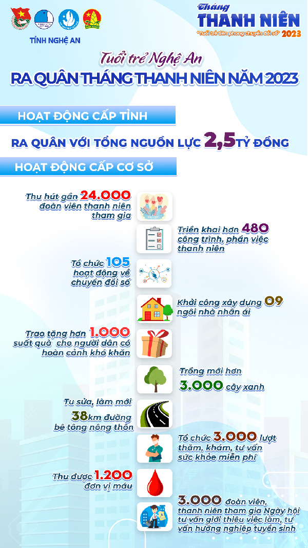 Theo đó, toàn tỉnh đã có 480 công trình, phần việc thanh niên, 105 hoạt động về chuyển đổi số, 09 ngôi nhà nhân ái được thực hiện; trao tặng hơn 1.000 suất quà cho người dân có hoàn cảnh khó khăn; trồng mới hơn 3.000 cây xanh; tu sửa, làm mới 38km đường bê tông nông thôn; Tổ chức 3.000 lượt thăm khám sức khỏe miễn phí; 1.200 đơn vị máu, 3.000 đoàn viên, thanh niên tham gia Ngày hội tư vấn giới thiệu việc làm, tư vấn hướng nghiệp tuyển sinh; thu hút gần 24.000 đoàn viên, thanh niên tham gia; tổng nguồn lực hơn 1,2 tỷ đồng.