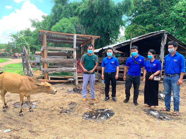 Phó Bí thư Tỉnh Đoàn Gia Lai Đỗ Duy Nam (thứ hai từ trái qua) tặng bò giống cho thanh niên nghèo xã Ia Pia, huyện Chư Prông. |
