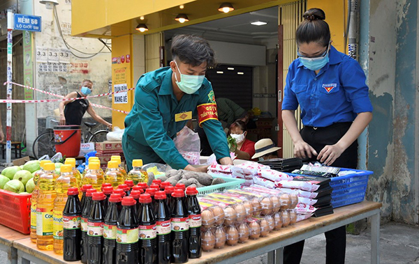 Đoàn viên, thanh niên thực hiện các gian hàng 0 đồng cho người dân tại các khu phong tỏa. ẢNH: NỮ VƯƠNG |