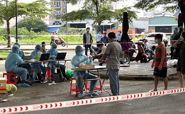 Thanh niên tình nguyện trực tiếp tham gia hỗ trợ tại các điểm lấy mẫu xét nghiệm ở quận Tân Phú, TP.HCM. THU DUNG |