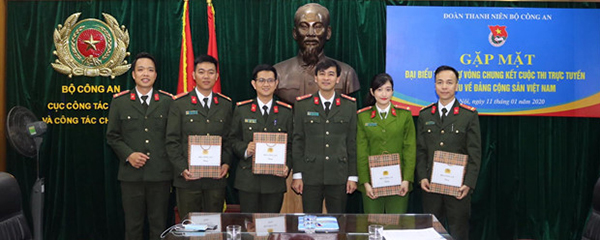 Anh Phương (bìa phải) cùng các đại biểu dự thi vòng chung kết cuộc thi trực tuyến tìm hiểu về Đảng Cộng sản VN. ẢNH: HẢI ĐĂNG |