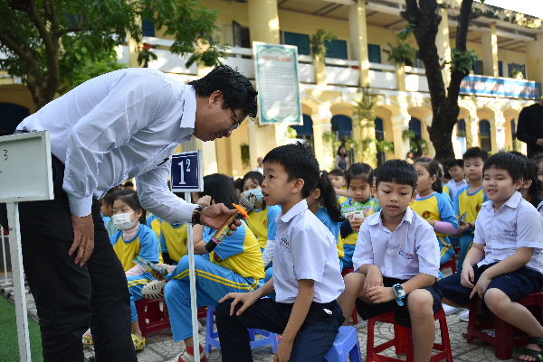 Ông Ngô Ngọc Hoàng Vương cũng đặt nhiều câu hỏi về môi trường để vừa lồng ghép kiến thức cho các em, đồng thời tăng tính tương tác, tạo bầu không khí sôi động, hoạt náo cho chương trình. |