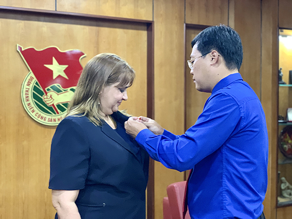 Bà Nancy Coro Aguiar, Phó Đại sứ Cuba tại Việt Nam bày tỏ rất vinh dự được nhận kỷ niệm chương “Vì thế hệ trẻ” do Trung ương Đoàn TNCS Hồ Chí Minh trao tặng, đồng thời gửi lời cảm ơn Bí thư thứ nhất T.Ư Đoàn Lê Quốc Phong.