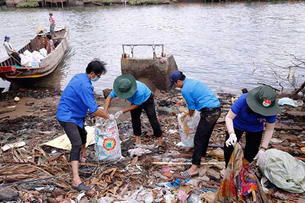 Đoàn viên, thanh niên thực hiện thu gom rác thải nhựa. |