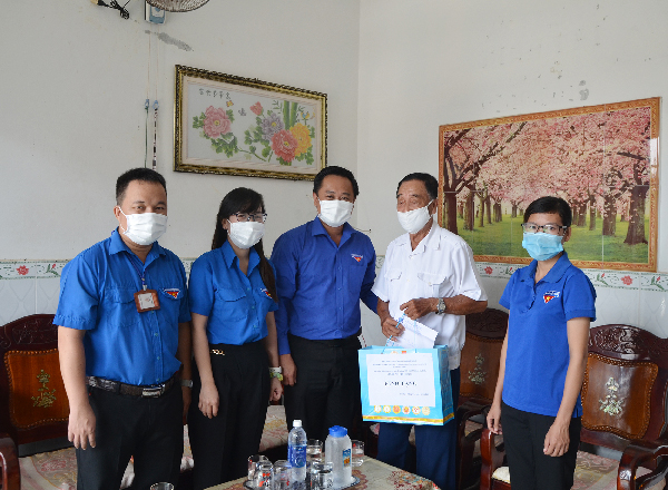 Anh Nguyễn Minh Triết, Phó Bí thư Tỉnh Đoàn, Chủ tịch Hội LHTN Việt Nam tỉnh thăm, tặng quà tới ông Lê Hà, cựu thuyền viên tàu không số. |