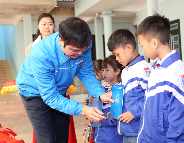 Anh Bùi Quang Huy, Uỷ viên dự khuyết BCH Trung ương Đảng, Phó Chủ tịch Uỷ ban Trung ương MTTQ Việt Nam, Bí thư thứ nhất Trung ương Đoàn và bà Nông Thị Hà, Thứ trưởng Bộ Dân tộc và Tôn giáo trao quà cho các em học sinh. |