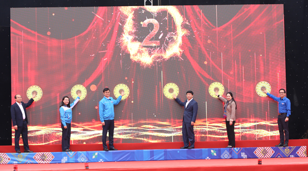 Các đại biểu thực hiện nghi thức khởi động Đề án “Tuổi trẻ Việt Nam đồng hành với thanh thiếu nhi vùng biên giới giai đoạn 2025 - 2030”. |