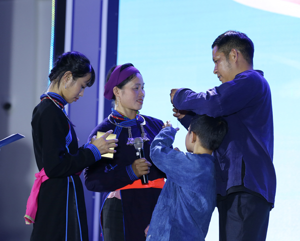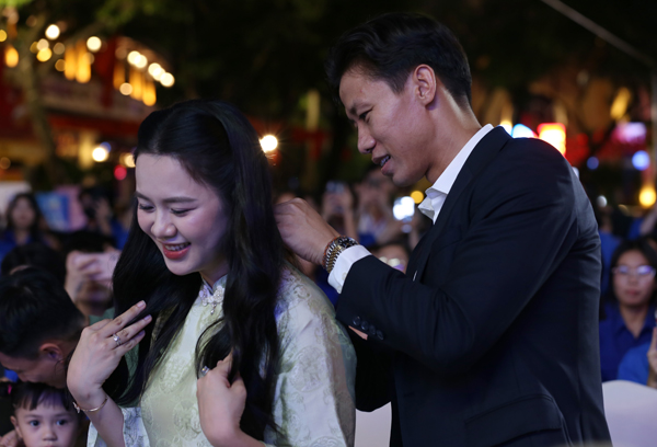 Cầu thủ Quế Ngọc Hải tặng quà cho vợ tại chương trình. |