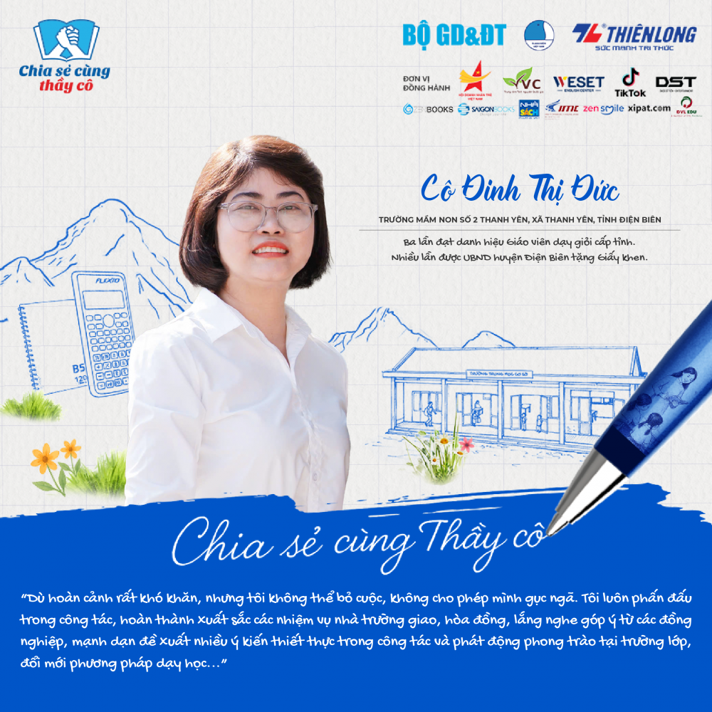 Cô giáo Đinh Thị Đức sinh ra và lớn lên tại mảnh đất Điện Biên Phủ anh hùng. Với tình yêu thương trẻ nhỏ, từ nhỏ chị đã ấp ủ ước mơ được trở thành cô giáo. Năm 2006, tốt nghiệp Trường Cao đẳng Sư phạm mẫu giáo TW1, chị được tuyển dụng về công tác tại trường Mầm non Suối Lư, huyện Điện Biên Đông. Cái tên cô giáo Đinh Thị Đức được đồng nghiệp, phụ huynh và các em học sinh gọi từ đó.