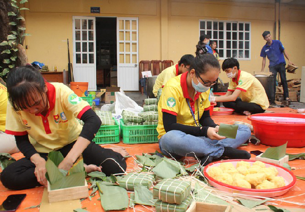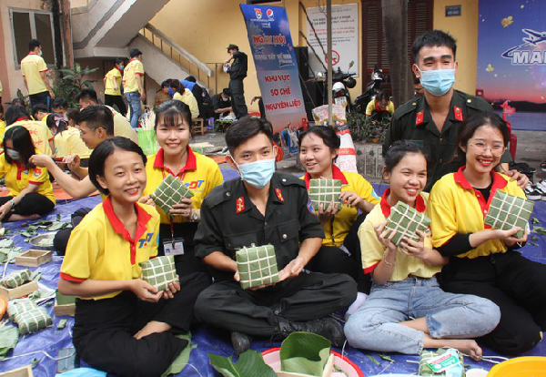 Các bạn sinh viên, hội viên thanh niên cùng các chiến sỹ gói, nấu bánh chưng để gửi tặng bà con nghèo. |